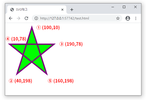 - point속성의 점의 위치가 지그재그형태로 들어가기 때문에 오각형이 아닌 별모양으로 나옵니다.
