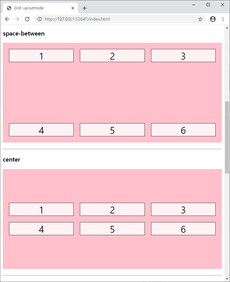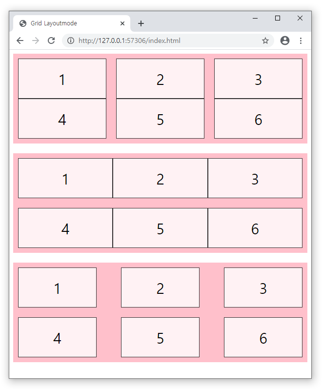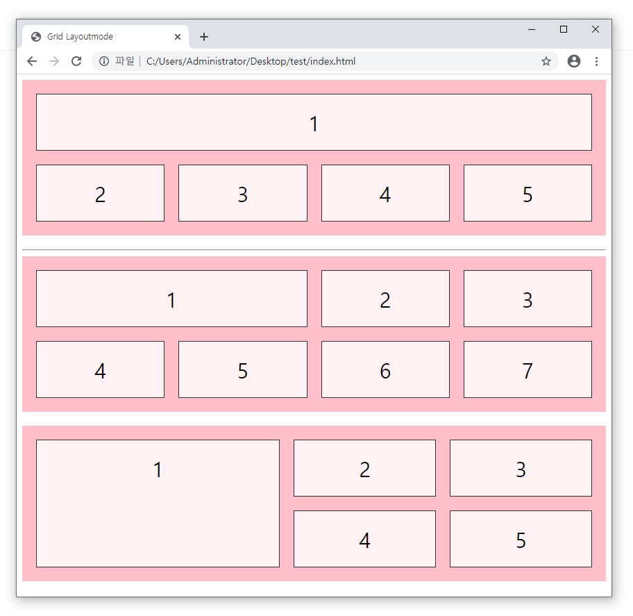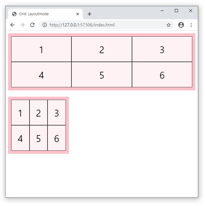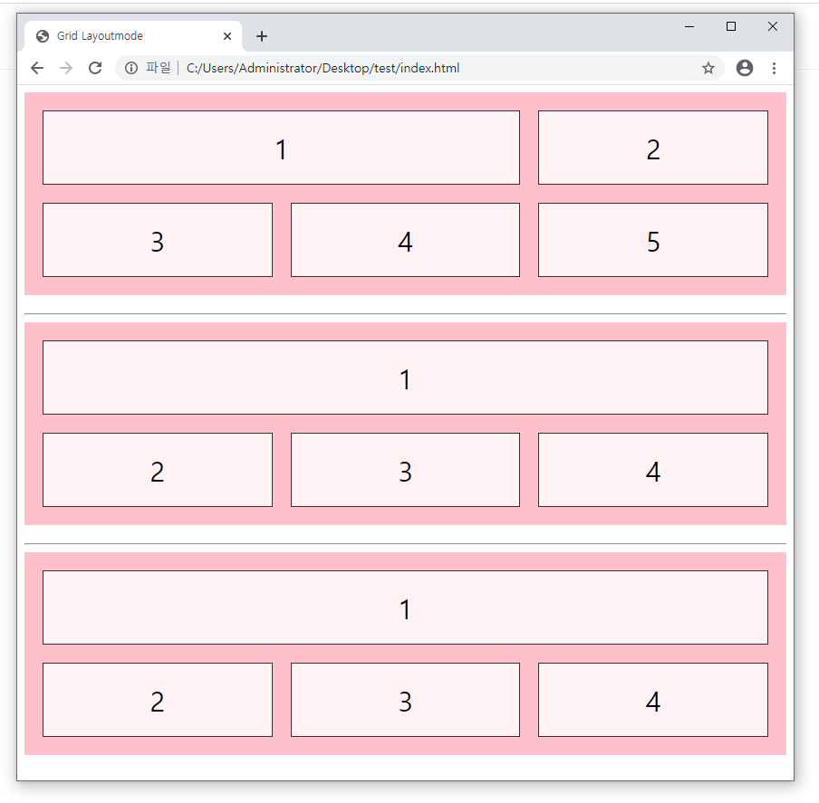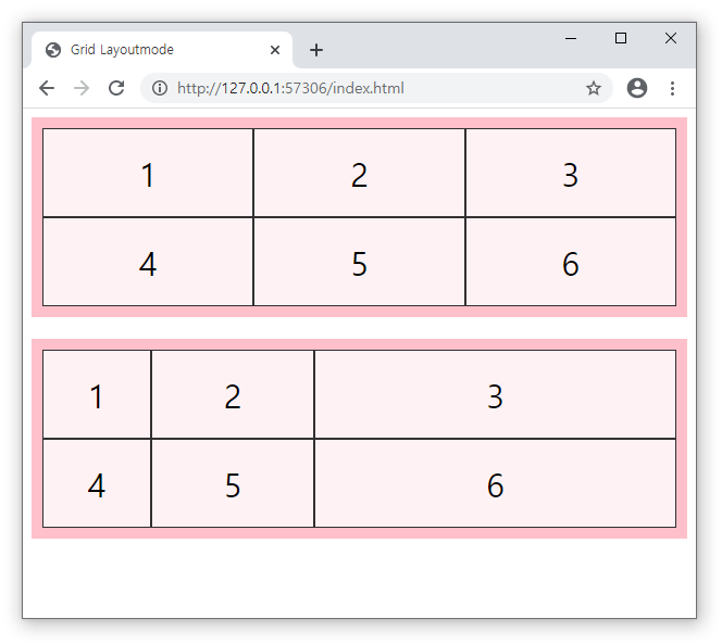 - 첫번째 grid-container는 칼럼수를 3개로 지정했고, 두 번째 grid-container는 컬럼수를 2개로 지정했습니다.
