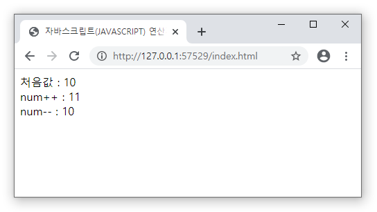 document.write('num-- : ' + num + '<br>');