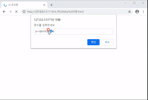 - 0~100사이일때만 [합격], [불합격]처리되고, 그외의 숫자는 다시입력하라는 경고창이 뜹니다.