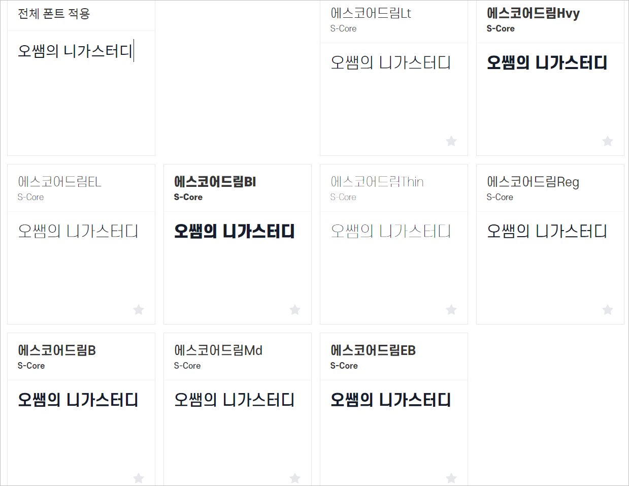 - 위의 이미지는 모든 에스코어 드림을 눈누폰트에서 적용해본 것입니다.