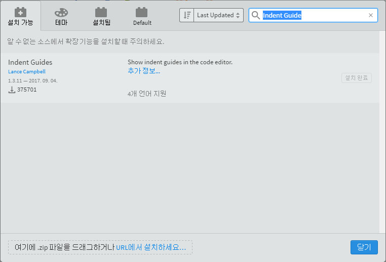 - 플러그인 설치 후 [보기] - [Indent Guide]선택해야 보임