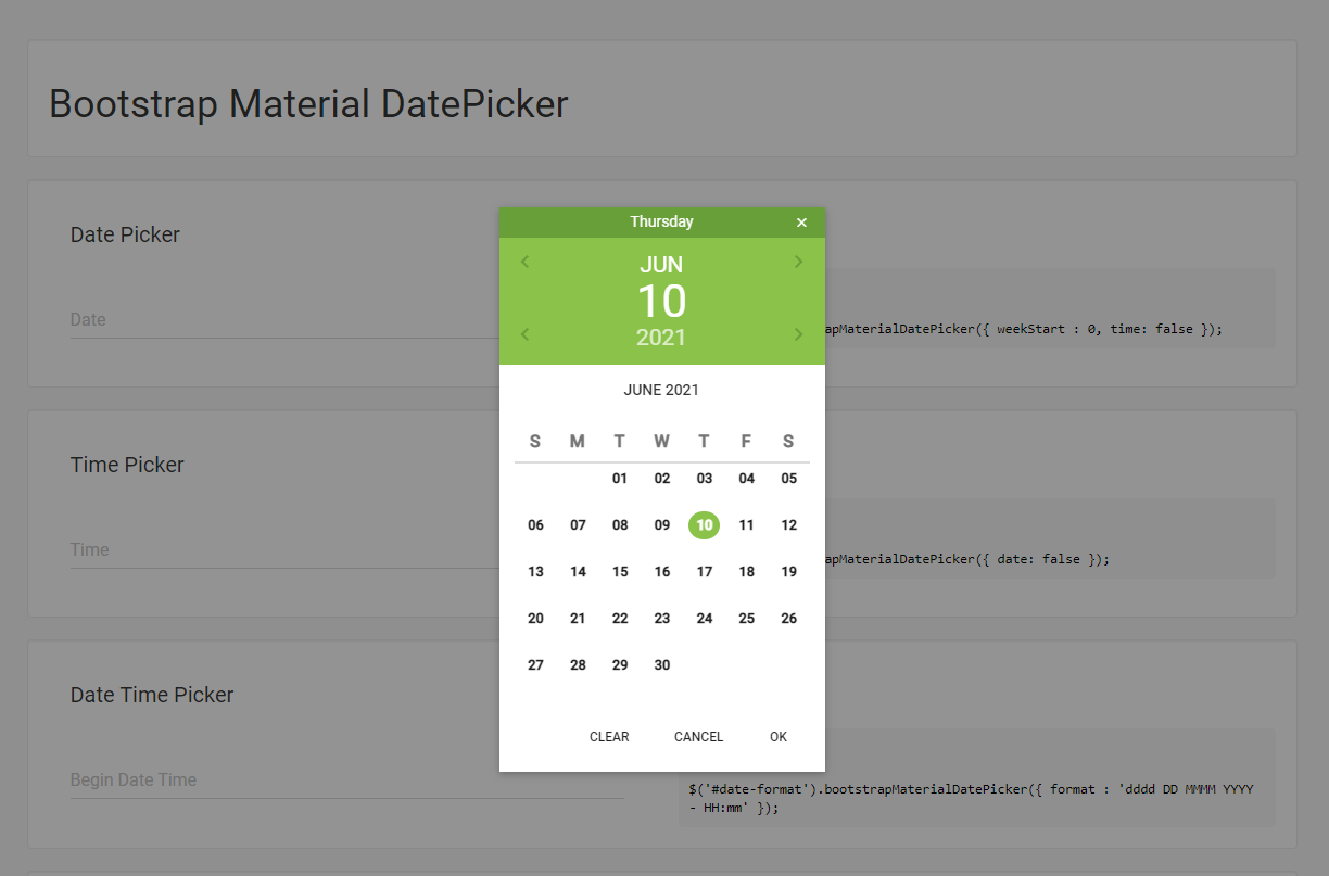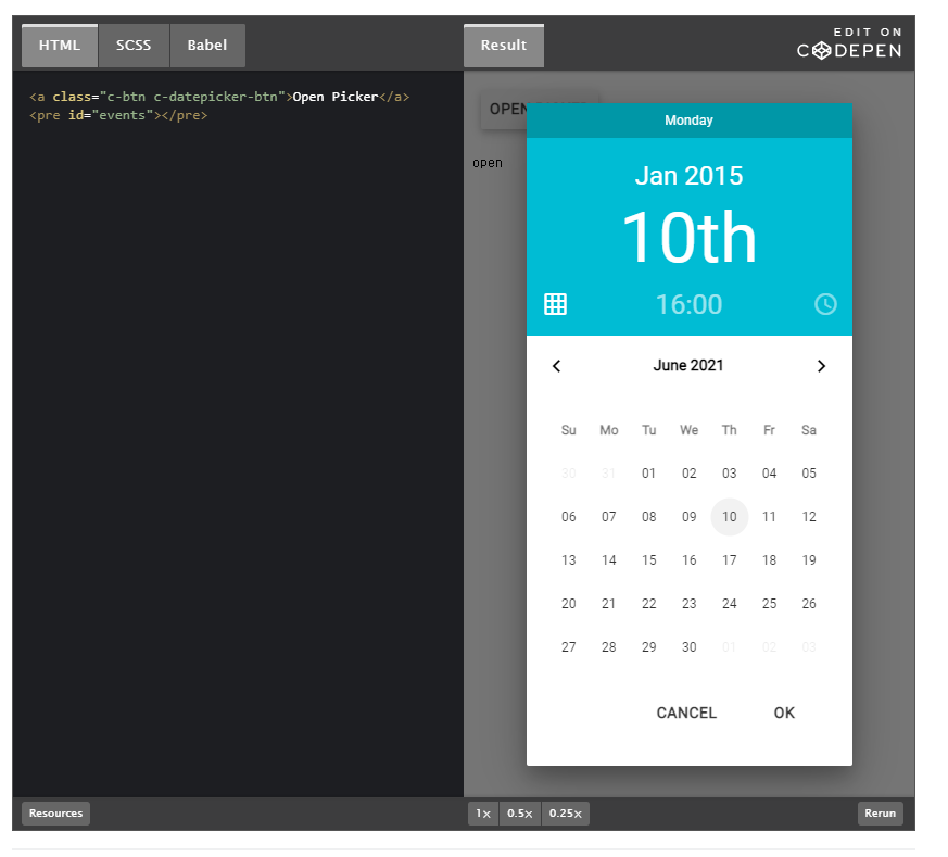 Material Datetime Picker A take on the material design date picker modal, built for the web. Works well with Materialize, or standalone. Installation npm install material-datepicker Dependencies The picker depends on Google's Material Design icons (package