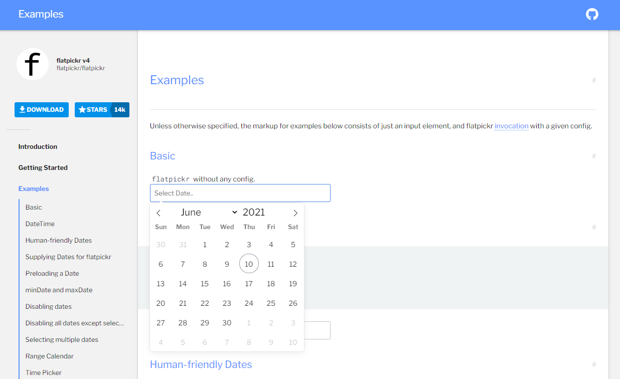 Introduction Introduction flatpickr is a lightweight and powerful datetime picker. Lean, UX-driven, and extensible, yet it doesn’t depend on any libraries. There’s minimal UI but many themes. Rich, exposed APIs and event system make it suitable for any