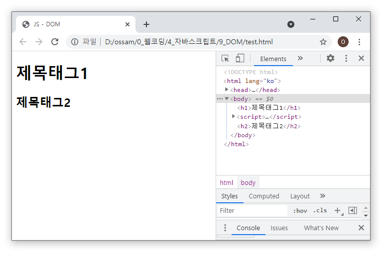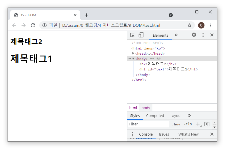 - 제목태그1 뒤에 제목태그2가 생성된 것을 확인할 수 있습니다.