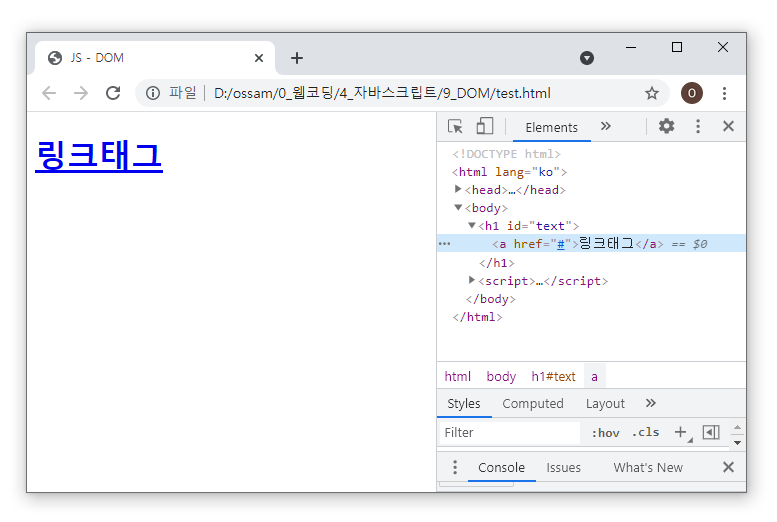 - 결과도 잘 나왔지만, 크롬 개발자모드에서 [Elements]부분을 확인해보면 h1태그 안에 자손으로 a태그가 들어간 것을 확인할 수 있습니다.