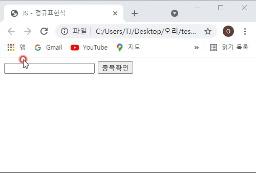 - [중복확인]버튼을 클릭했을때 영어대소문자와 숫자가 아닌 값이 입력되어 있으면, [영어대소문자와 숫자로만 작성하시오]라는 경고창이 뜨도록 해보겠습니다.
