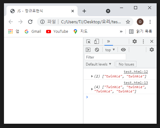 - g 플래그를 사용하지 않은 첫번째 콘솔은 일치하는 문자열 전체를 반환하여 보여줍니다.
