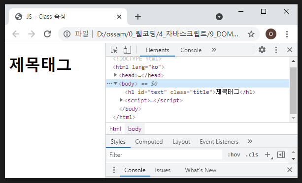 - <h1> 태그에 클래스명을 추가해보았습니다.