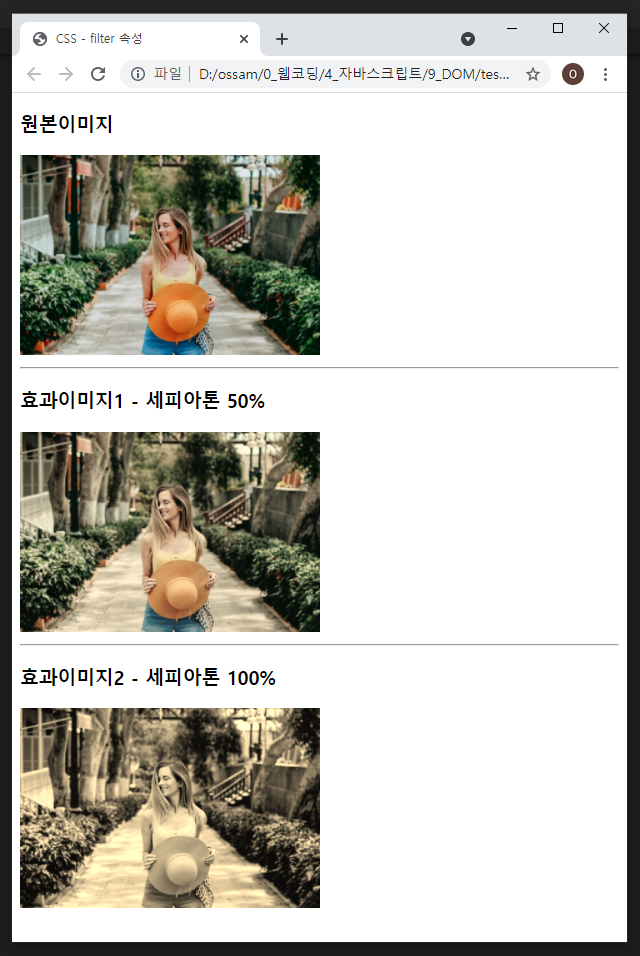 | sepia(%) | 이미지를 세피아톤으로 변환 0%~100%, 0%가 기본에 원본 |