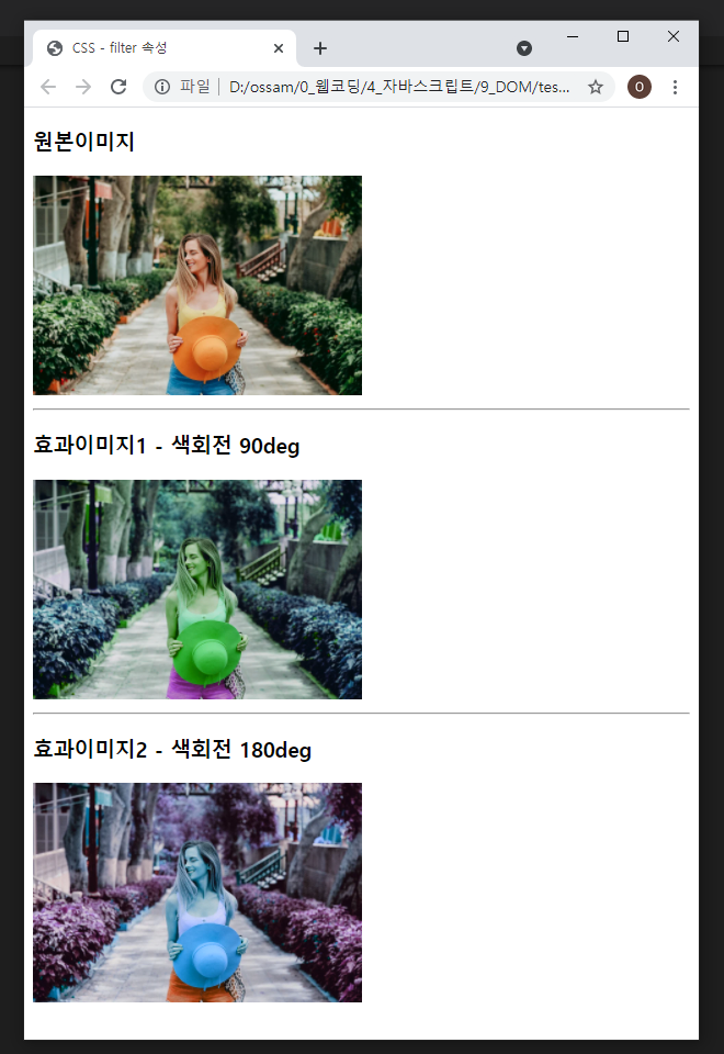 | hue-rotate(deg) | 이미지에 색조 회전을 적용 0deg ~ 360deg |