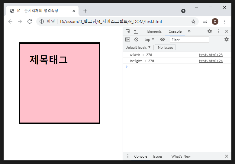 - 가로폭인 200px과 패딩 양쪽 30px x 2, 테두리 양쪽 5px x 2를 더한 결과인 270로 나오는 것을 확인할 수 있습니다.