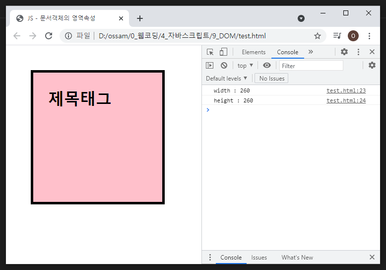 - 가로폭인 200px과 패딩 양쪽 30px x 2를 더한 결과인 260로 나오는 것을 확인할 수 있습니다.