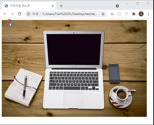 - 위 예제는 노트북, 커피, 노트에 이미지 맵이 들어간 상태라 클릭하면 엘지전자, 스타벅스, 오피스디포 사이트가 나오니다.