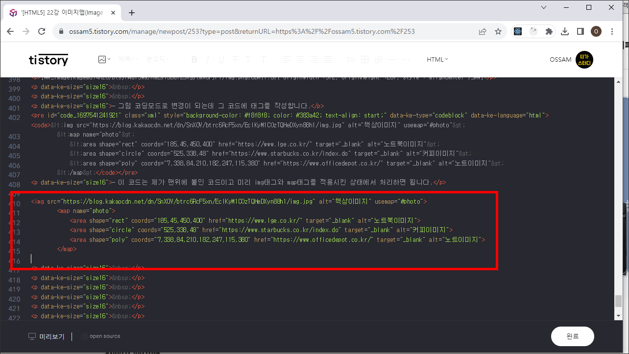 - 티스토리에서 이미지 맵을 쓰고 싶다면 코드로 제작해야 합니다.