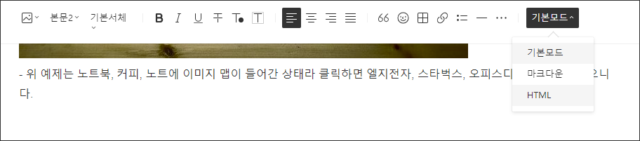 - 글쓰기 모드에서 [기본모드]가 아닌 [HTML]로 변경합니다.