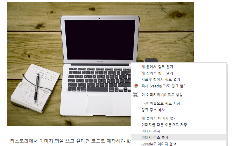 - 그리고 그 글에서 이미지에 마우스를 올리면 이미지 주소 복사가 나옵니다.