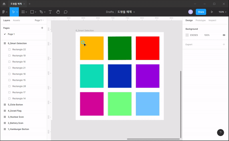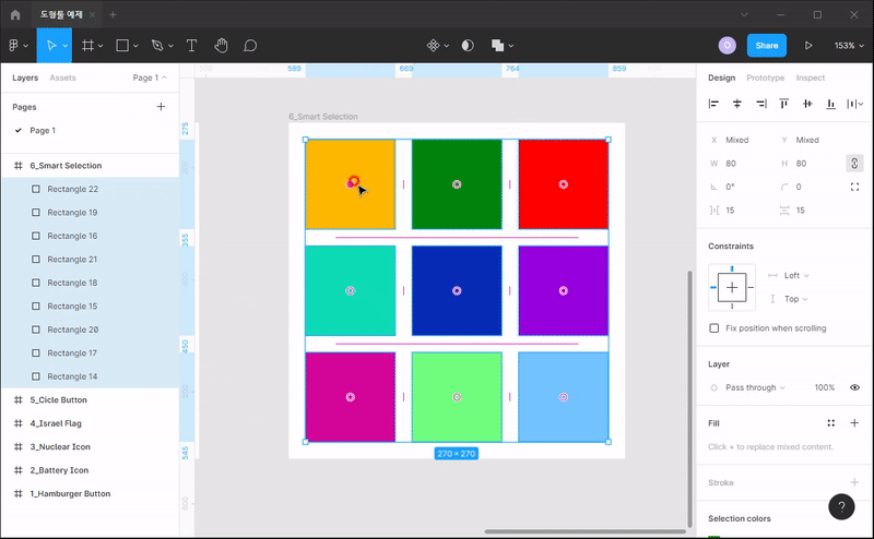- 도형을 그리다보면 간격이 잘 맞지 않을 수 있습니다. 이때 스마트 셀렉션을 사용하면 편하게 간격을 바꿉니다.
