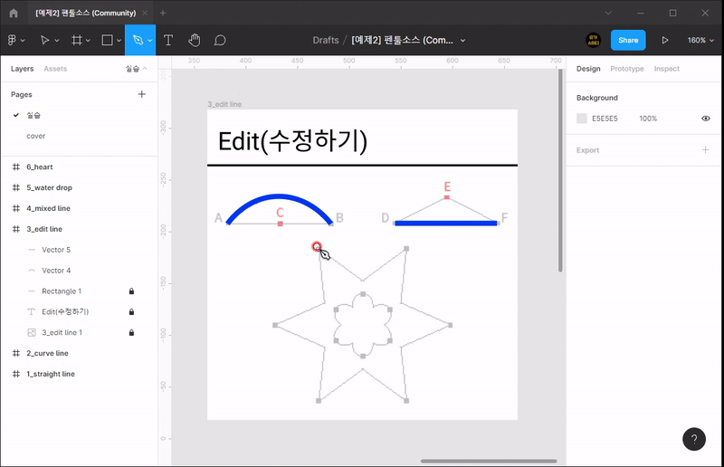 - 이번에는 D -> E -> F로 점을 찍은 직선을 그리고 E점을 빼보도록 하겠습니다.