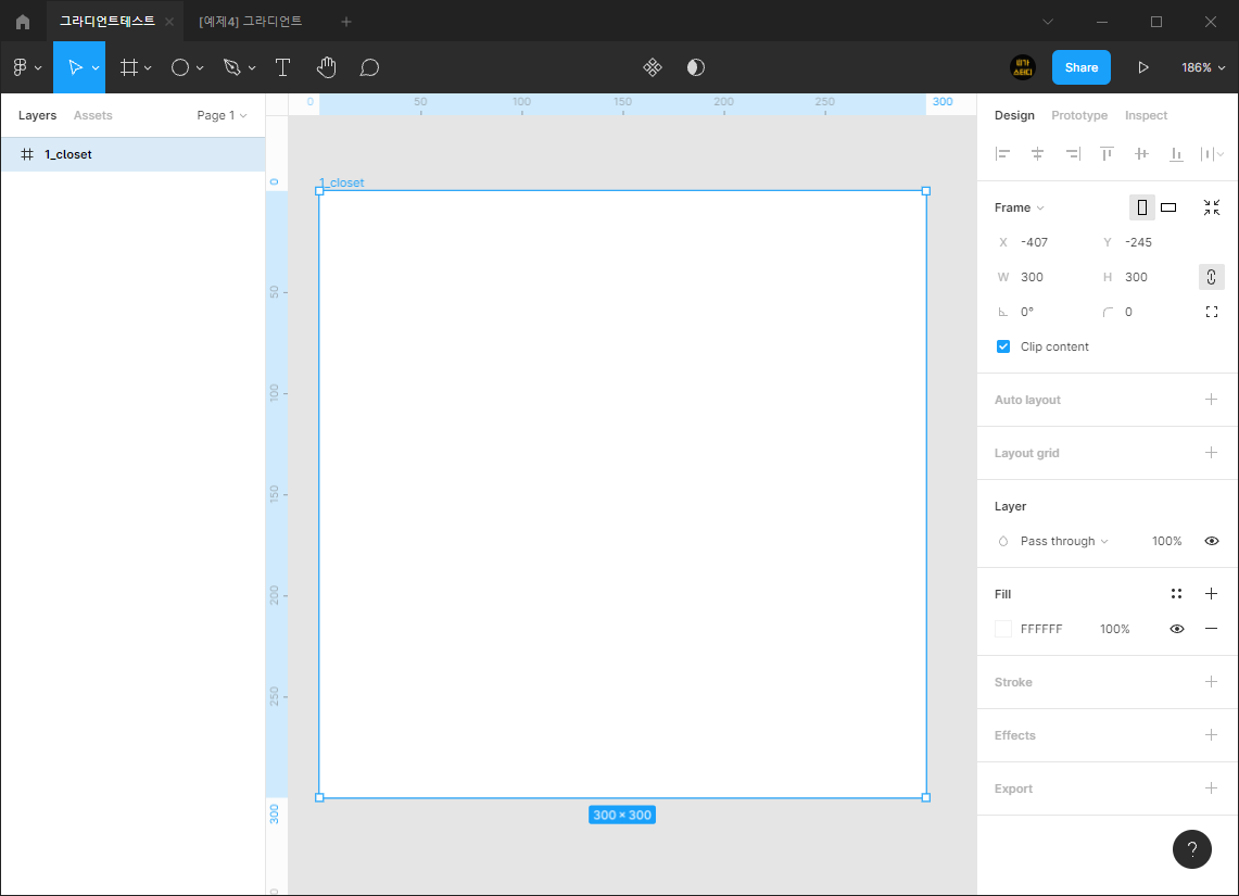 1) Frame을 생성해서 [300x300]으로 처리하고, [1_closet]라고 이름을 변경합니다.