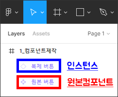 - 피그마는 컴포넌트와 인스턴스를 레이어패널에서 아이콘으로 구분을 짓습니다.