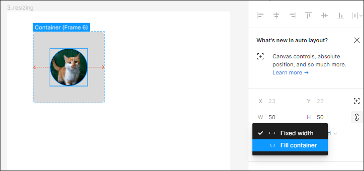 - 그럼 고양이 사진을 클릭하고 [Design]패널의 사이즈 아래 [Fixed]부분을 [Fill Container]로 변경하면 됩니다.