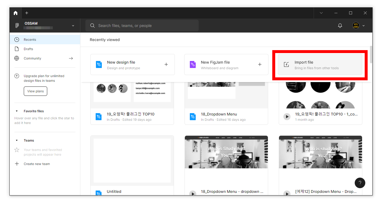 - 불러올 때는 피그마 첫 화면에서 [Import File]버튼을 눌러 불러오면 됩니다.