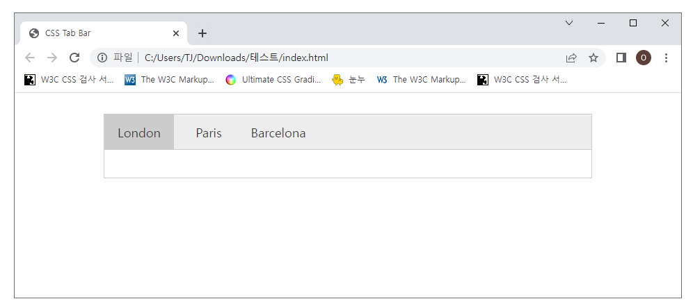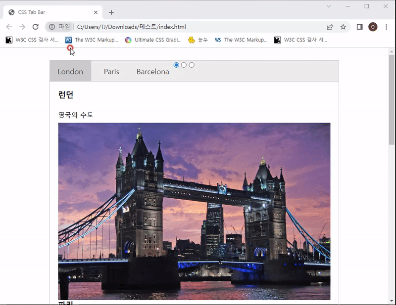 - [London]버튼을 클릭하면 런던 이미지가 보이고, [Paris]버튼을 누르면 파리이미지가 보이고, [Barcelona]버튼을 클릭하면 바르셀로나 이미지가 보이는 탭바컨텐츠를 제작해보겠습니다.