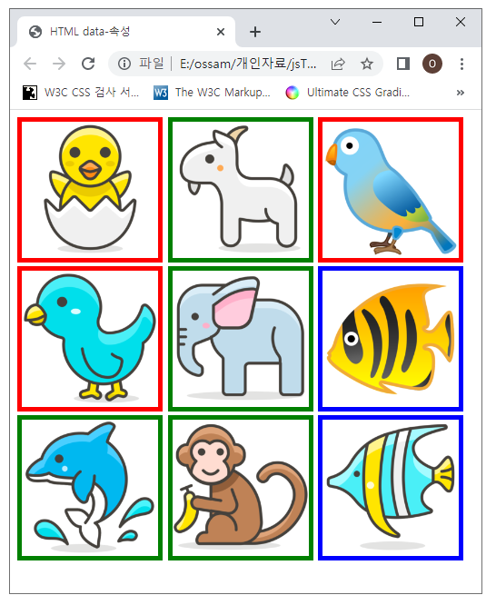 - CSS에서 속성 선택자로 각각의 동물 타입값을 지정해서 테두리를 각각 처리했습니다.