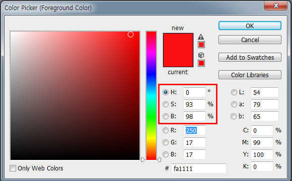 - 색상, 채도, 명도의 수치를 이용해 색상을 선택하는 방식