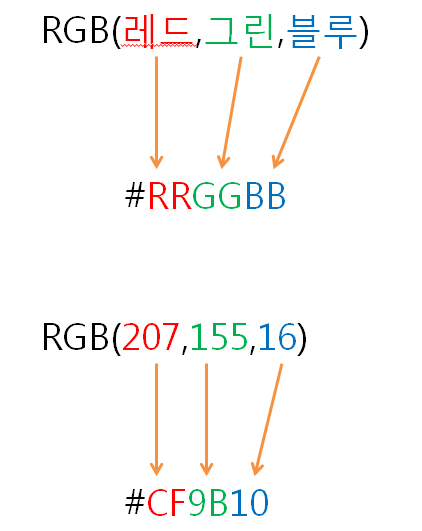 - 문법 : rgb(레드수치, 그린수치, 블루수치);