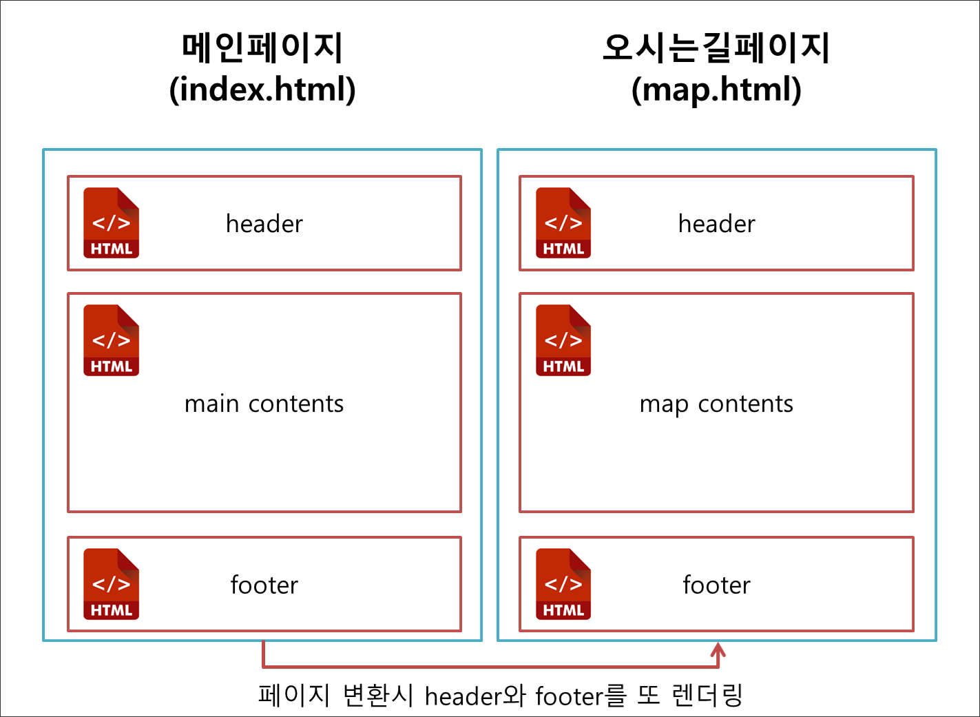 - 그리고 제작시 header에 있던 글자 하나만 변경하려 해도 모든 페이지의 글자를 변경해야 하기 때문에 대규모 프로젝트에서는 많은 시간 낭비가 있었습니다.