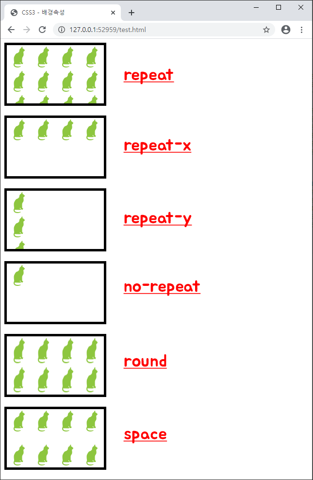 | space | 배경이미지를 짤리지 않게 반복하고 남는 영역은 이미지간의 간격을 늘려서 처리 | |