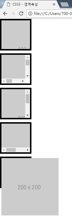 | scroll | 가로, 세로 스크롤이 모두 생겨 부모영역보다 넘치는 부분을 스크롤바로 볼 수 있게 처리 | |
