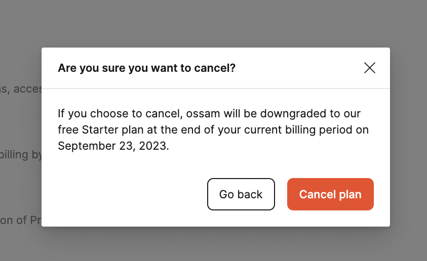 취소하기로 선택하시면 2023년 9월 23일 현재 청구 기간이 끝나면 ossam이 무료 스타터 플랜으로 다운그레이드됩니다.