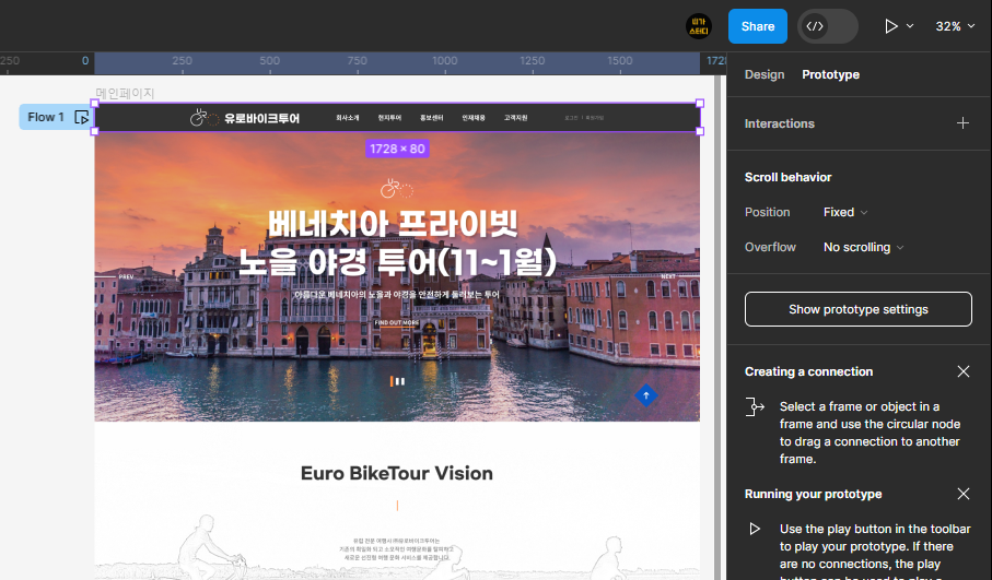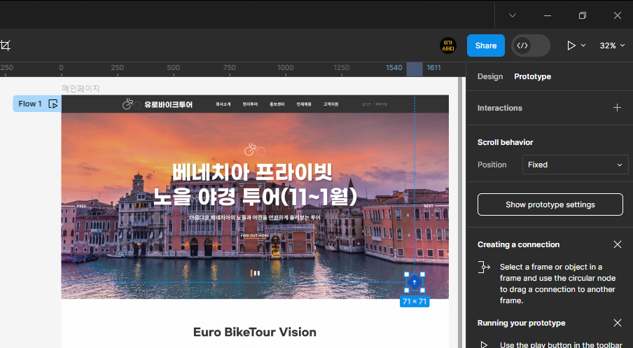 - 우측 상단의 플레이 버튼을 누르거나, [Ctrl]+[Alt]+[엔터]를 치면 프로토타입이 실행이 됩니다.