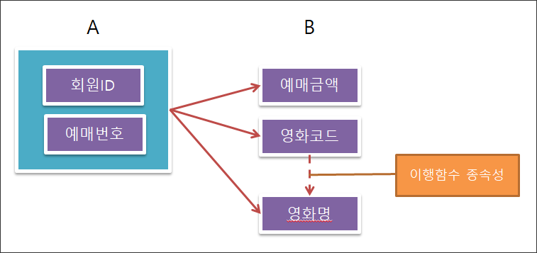 - 위처럼 영화명이 영화코드에 종속되는 것을 이행함수 종속성이라고 합니다.