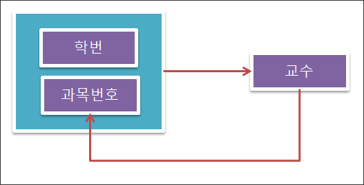 - 위 그림처럼 기본키(학번, 과목번호)가 교수를 함수적으로 종속하고 있습니다.