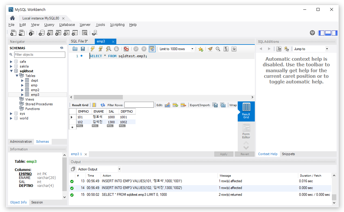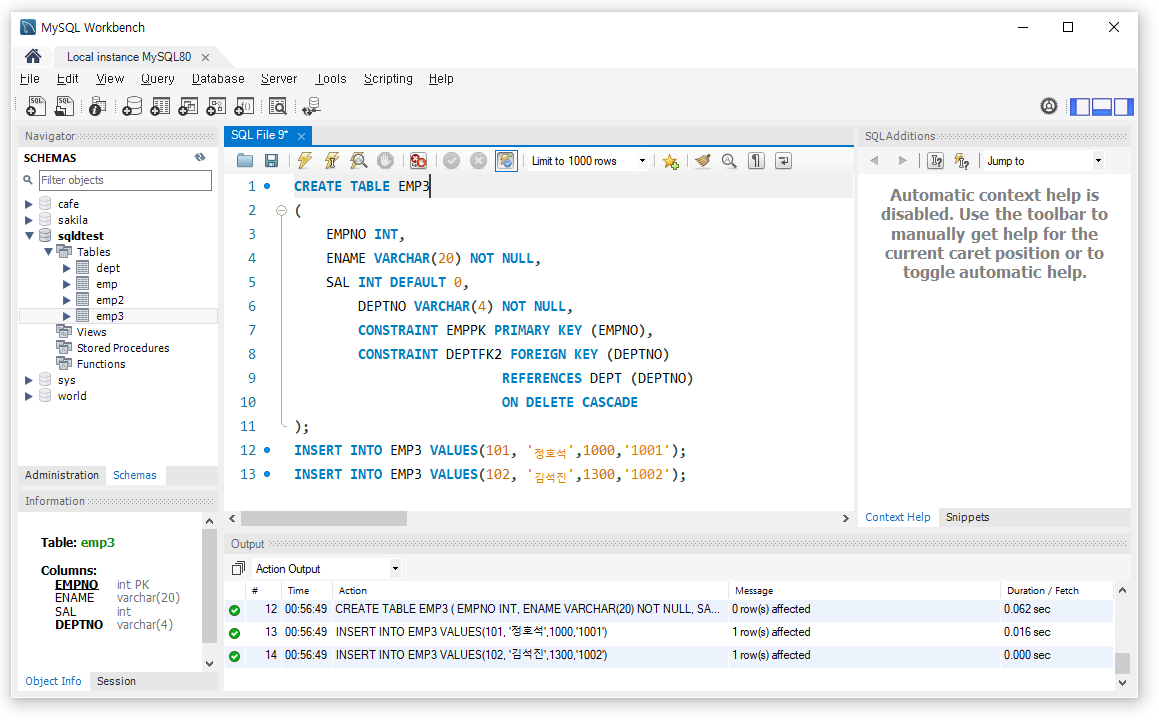## EMP3테이블 생성 시 CASCADE 설정 + 데이터 2개 추가