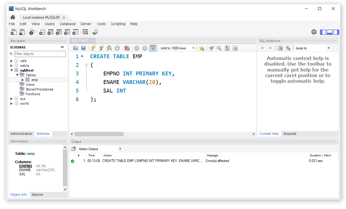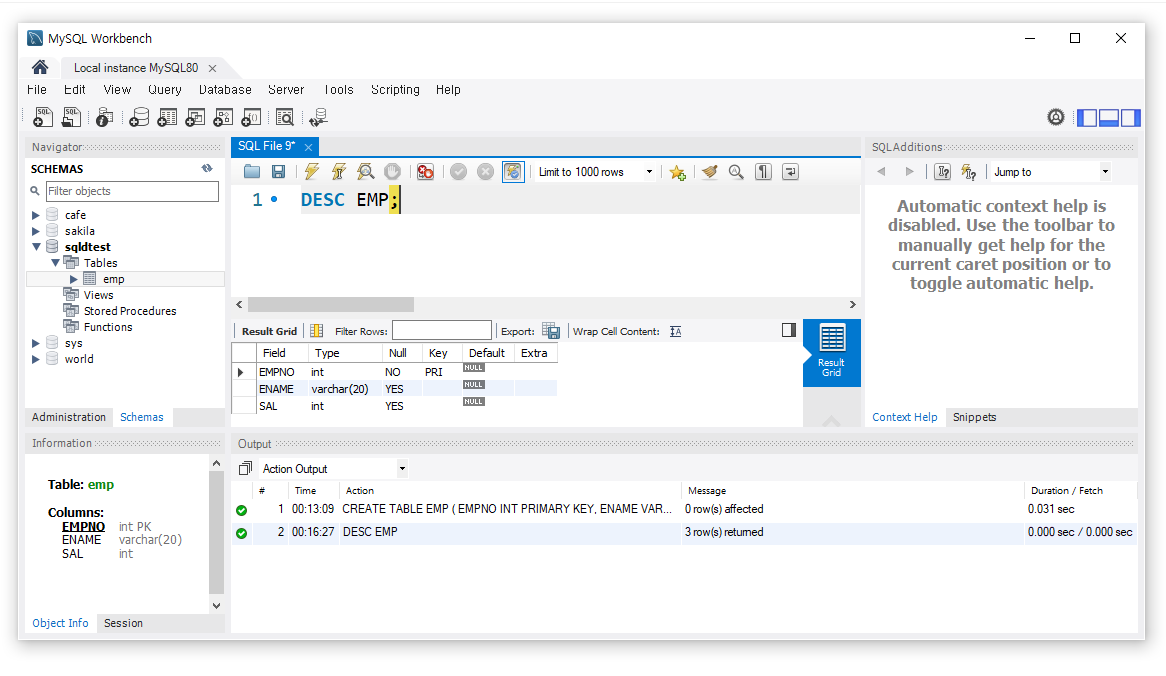 - [Ctrl]+[Enter]로 명령을 실행하면 테이블 구조가 뜨는 것을 확인할 수 있습니다.