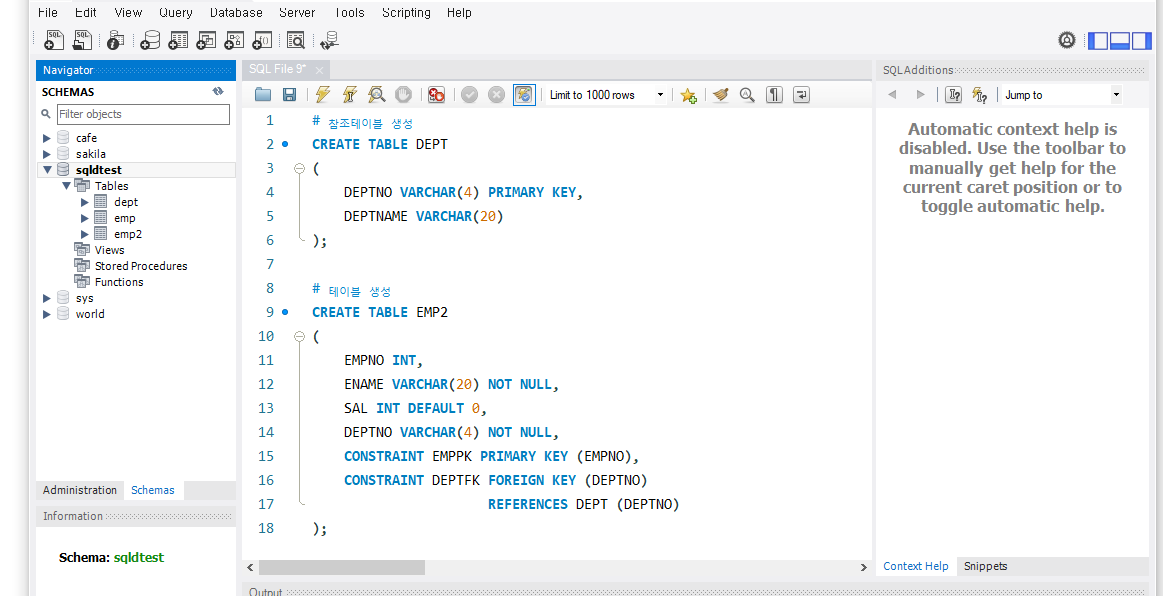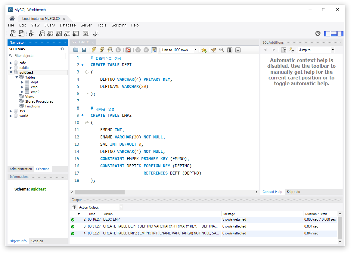 - 명령을 실행해보면 DEPT테이블과 EMP2테이블이 생성됩니다.