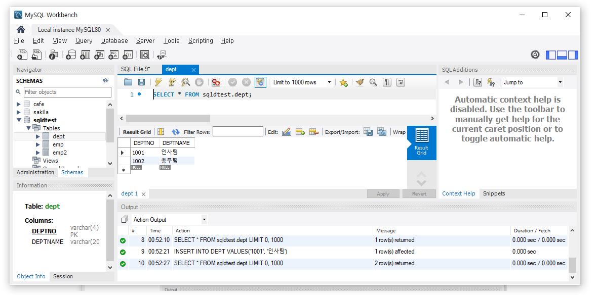 INSERT INTO DEPT VALUES('1001', '인사팀');