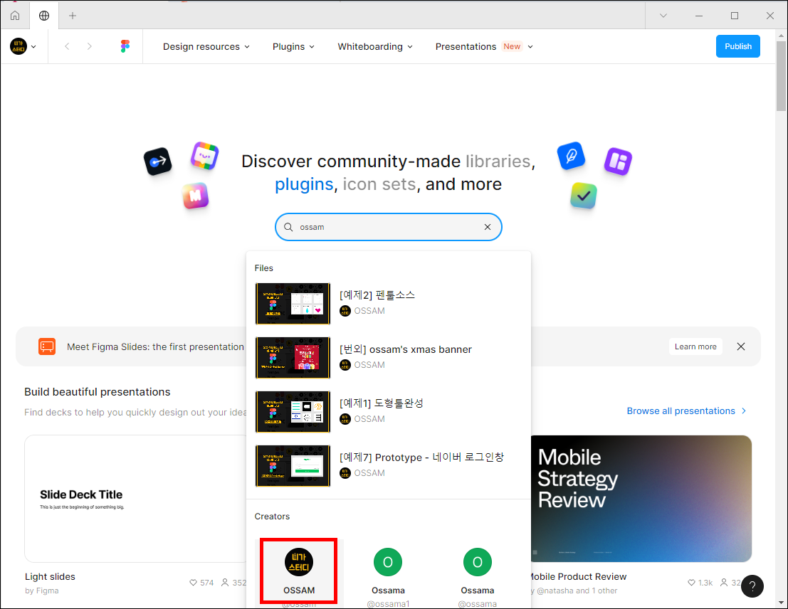 2. 검색창에 ossam이라고 검색합니다. creator 중 ossam을 선택합니다.