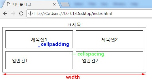 | cellpadding | 셀(칸)과 컨텐츠(텍스트, 이미지등)와의 간격 조절(셀의 안쪽 여백) |