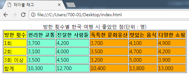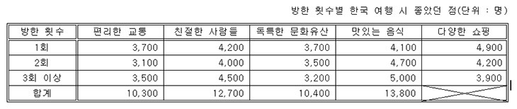 <caption>방한 횟수별 한국 여행 시 좋았던 점(단위 : 명)</caption>