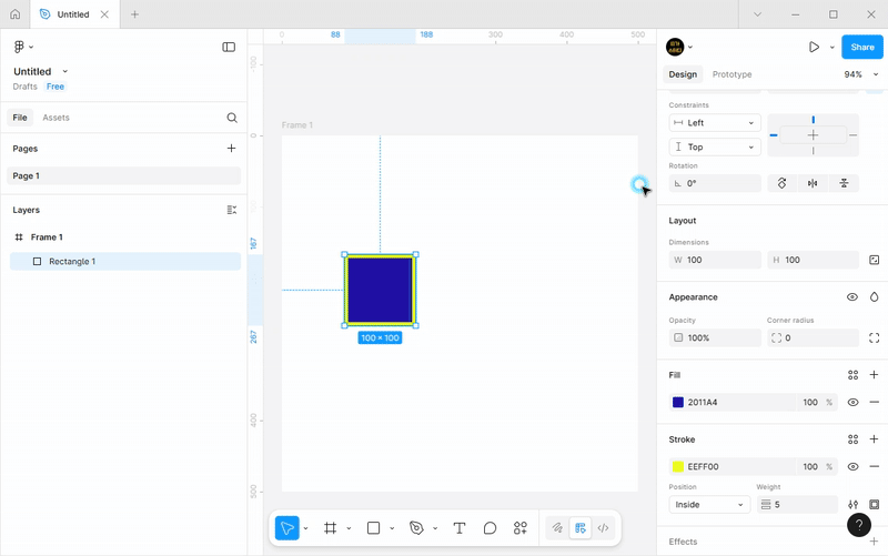 - 프레임에 클릭하면 아래와 같이 100x100 사이즈의 도형이 나옵니다.