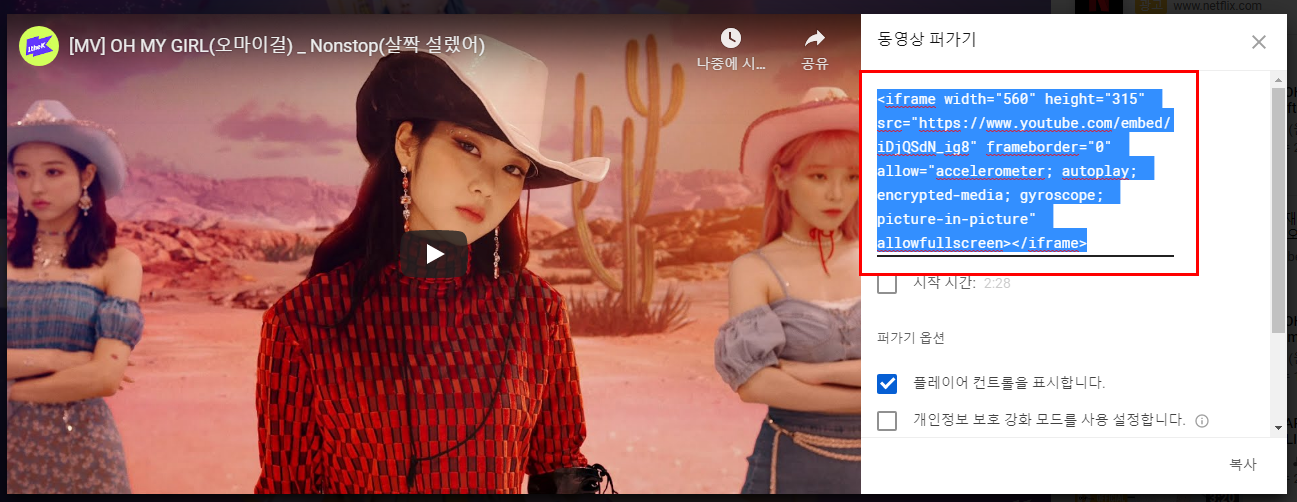- 빨간색으로 체크한 <iframe>태그를 복사한다.