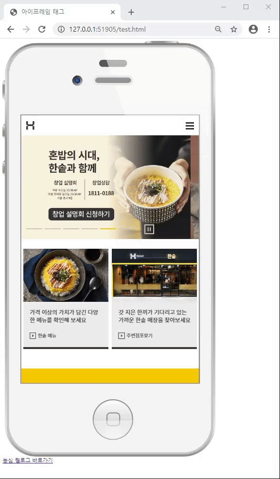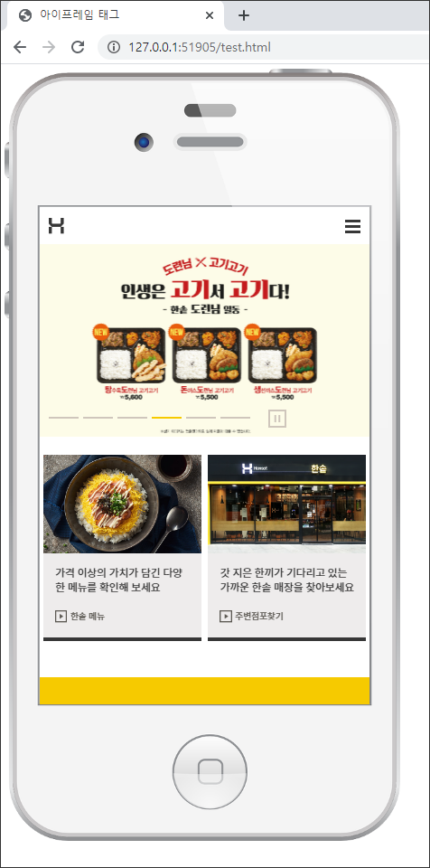 - iframe에 한솥도시락 반응형웹페이지를 넣으면 모바일 상태로 보이게 된다.