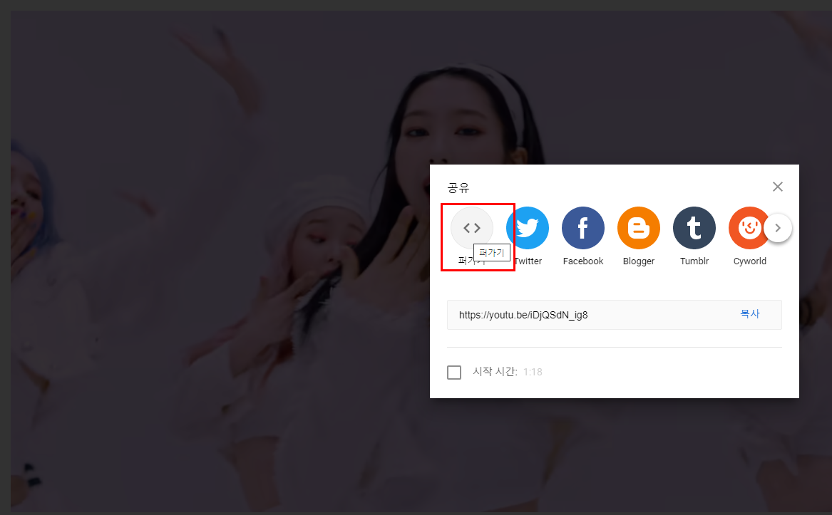 - 영상의 하단쪽에 있는 공유버튼을 클릭한다.
