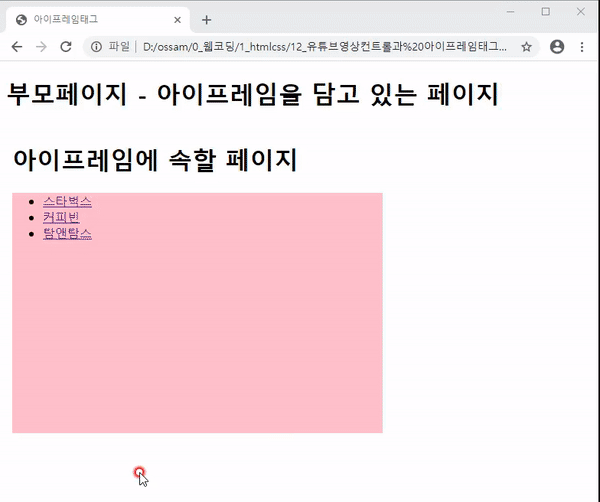 - iframe에 name속성이 이름을 지정하고 a태그의 target에 그 이름을 값을 작성하면 그 페이지가 iframe내부에서 보인다.